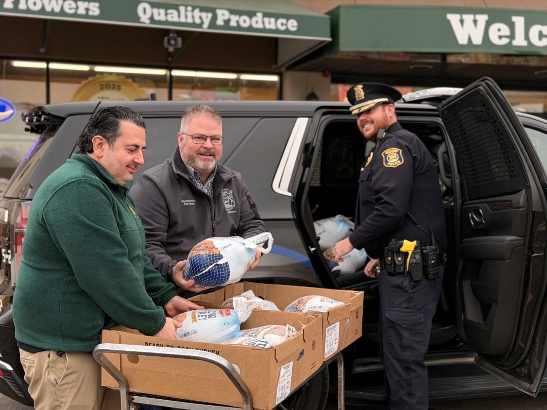PHOTO INFORMATION: State Rep. Phil Green (second from left) joined Paul Kado, store director at Andy’s Quality Market in Metamora, and Metamora Township Police Chief Ryan Davis to deliver 24 donated turkeys to Metamora Township residents on Thursday, Nov. 20.